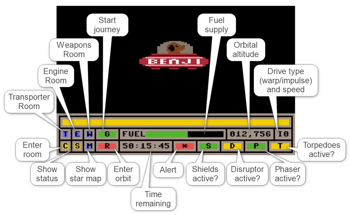 The console and statistics from the storage room, engine room, and armory are displayed in monochrome text mode (screen memory at address $4400, character set at $5000). For larger, high-resolution graphics (such as Benji's head in the title screen or the planets on the star charts), the program switches to multicolor bitmap display in the middle of the screen via a raster line interrupt (bitmap at address $6000, screen memory at $4400).