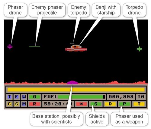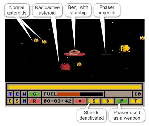 Benji's spaceship, all enemies, asteroids and missiles, as well as the scientists' prison, are sprites; the enlarged view of the spaceship on the console even consists of four sprites. The beam used to beam the scientists up into the rescue spaceship, however, is part of the text display.