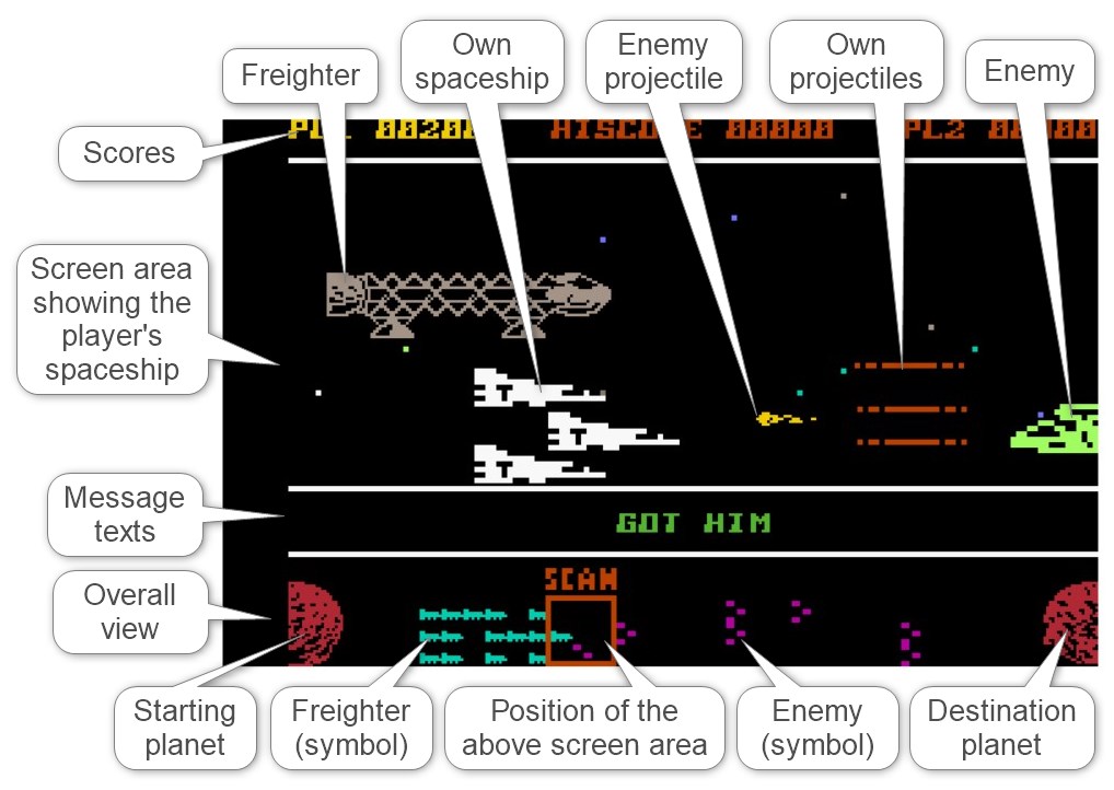 During the game, the screen is divided vertically into four sections, each displaying different information and graphics across the full screen width on a black background: The top line of text shows the current scores of the two players on the left and right, and the current highest score in the center. The largest section, extending from line 3 to line 17, shows the squadron controlled by the player and its immediate surroundings, including freighters and enemies. Line 19 is reserved for status messages, and finally, lines 21–25 show a scaled-down side view of the entire flight path with symbolic representations of all spacecraft, with the area where the player's squadron is located highlighted by a square marker. The areas are visually separated by white, horizontal lines.