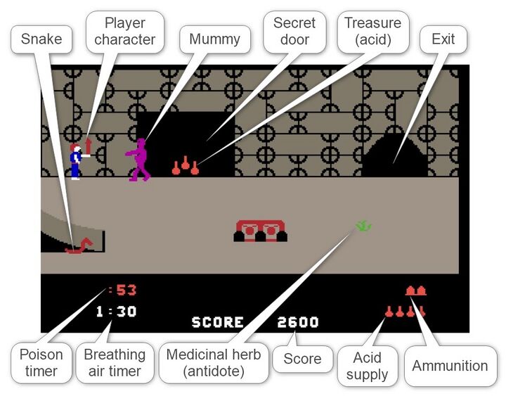 Inside the temple, the player moves through a series of vertically stacked chambers connected by slides. Switching between these chambers and the slides is done via a flick screen. Each chamber contains a secret door behind which treasures and useful items await — but behind these doors, as well as in the chambers themselves, snakes, giant spiders, and walking mummies lurk, waiting for the intruder.