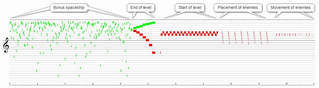 "Round About" doesn't offer any background music, but it underscores numerous in-game events with a variety of monophonic and polyphonic sound effects. The following illustration, for example, clarifies the sound output when advancing to the next level: Initially, a monophonic, completely chaotic sequence of sounds accompanies the acquisition of a bonus ship, followed by two opposing sequences of sounds at the end of the level and a trill lasting almost two seconds at the start of the next level. Eight short notes with a rapidly decreasing frequency then accompany the appearance of the eight enemy spaceships, which subsequently move throughout the game to rhythmic, repetitive sounds.