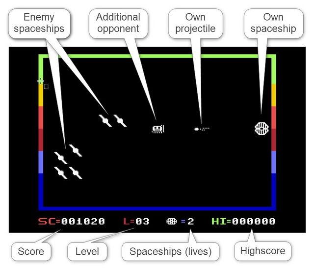 The entire game takes place within a rectangular screen area, along the edge of which the player can move their spaceship. The projectiles fired by the player always travel perpendicular to the edge closest to the spaceship, necessitating frequent changes of position during combat against the invaders. A status bar at the bottom of the screen displays the current game progress and high score.