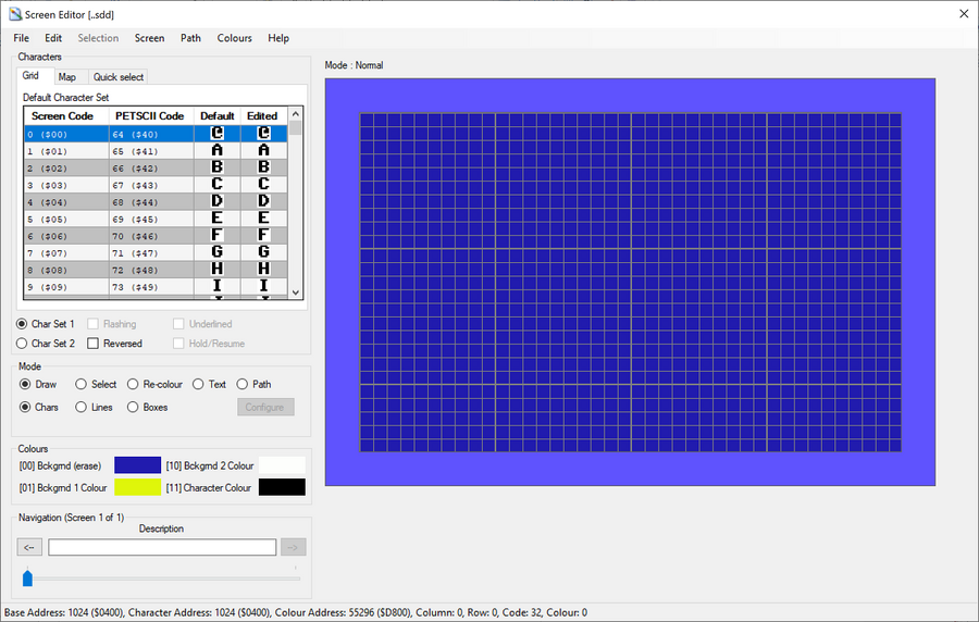 This is the main mode . Choose a character to draw with by clicking it in the character grid, then click the left mouse button on the screen grid to plot the character. Click the right mouse button to erase (set to space) the character. The character is plotted with the current character colour.