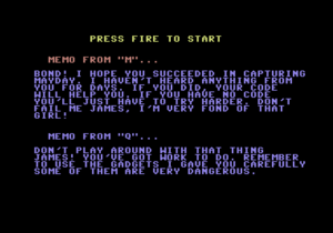 Shmendric: "During the title tune the gooseflesh started, here also the (grotty) speech output sequence cannot rescue anything. The game looks graphically, as if it was painted by kindergarden children. Concerning these points, I have a relatively contrary impression than the Happy Computer review (see above). Concerning the character one refuses to acknowledge it as James Bond, thats how miserable it looks. The ideas are nice, but no fun in the game can arise with such a technical botch. 2 points."