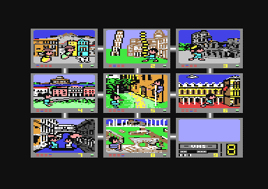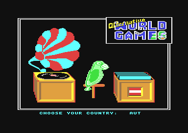 At the beginning of the game you enter your name (confirm with "Return"). Of course here you can play for the country of your choice. For this you pick a record with the flag of your choice out of the LP box and a parrot, which sits next to it, takes out the LP with its beak and puts it on the phonograph (joystick forwards/backwards, then fire). Then the hymn is played. This can be repeated until the names of all players have been entered, to finish you press "Return" in an empty name field.