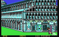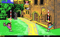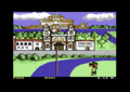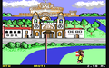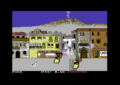 The sack race takes place on a street in Neapel. At the beginning you can see a few houses and you are asked to choose an opponent. Then you are waiting with your opponent in the wings and another figure is standing between the houses to give the start signal. By pressing fire a dog comes in from the left edge of the screen and the figure between the houses inflates a balloon. When the balloon bursts, the race through the streets begins.