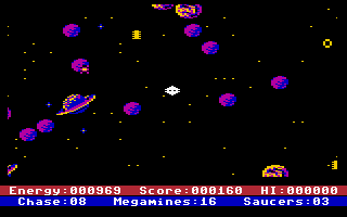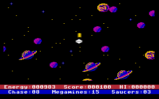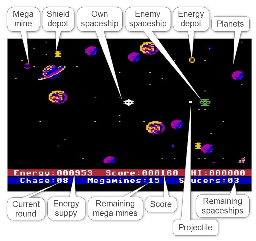 During his mission, the player maneuvers his spaceship within a rectangular force field in which the enemy has enclosed Earth and several other planets. During his flight maneuvers, he must locate and destroy all the mines, avoiding collisions with celestial bodies and the edges of the force field, as these will deplete his limited energy reserves.