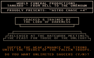 With the Crack of Tankard (left animation), the intro should not be skipped, otherwise the display of the spaceship during the honors after every fourth round will be incorrect. Furthermore, this crack occasionally freezes after exiting the Cracktro using the spacebar. The reason for this is that it (presumably unintentionally, in the following code section at address $0997) sets all bits in the VIC interrupt mask. Pressing the spacebar pulls the VIC's input pin LP to a low level, triggering a lightpen interrupt that is not acknowledged in the kernel's IRQ routine, causing this routine to be executed repeatedly: