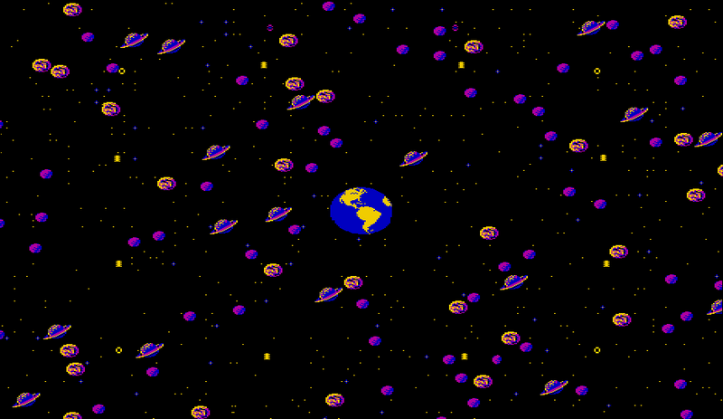 The game world is stored internally as a 128 × 72 character map in a buffer at address $5C00...$7FFF. At the beginning of each level, the program clears this memory area (fills it with null bytes) and then randomly draws the celestial bodies of the galaxy. During the game, the scrolling routine always starts from the address of the character in this map that should be visible in the top-left corner of the screen and copies the contents of a total of 19 screen lines into screen memory. The source and destination addresses of this copy operation are first initialized from the pointers to $00DA...$00DD (see table above) and then incremented line by line in the code by self-modification (the source addresses by 128 bytes each, the destination addresses by 40 bytes each):