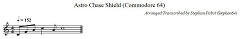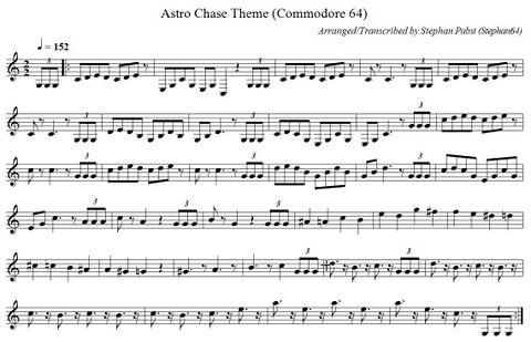 A monophonic accompaniment melody (Tchaikovsky's "1812 Overture", according to the manual) plays continuously throughout the game. A short musical sequence also sounds when the shield is activated. The following gallery shows these musical pieces in standard notation. For creative use, the sheet music is also available as a PDF document (File:AstroChase Theme PDF.pdf) and in ABC musical notation (File:AstroChase Theme.abc.txt).