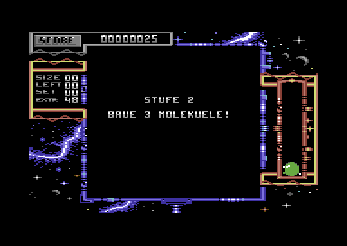 In the Extra round the whole game area is filled with atoms and the player needs to sort them around (without time limit) so that a big molecule without any free connections is created. Es soon as a molecule has been created new atoms start to fall into the shaft again, therefore you should be careful while rearranging not to create a small molecule as the rest of te atoms will then be staying on the screen.