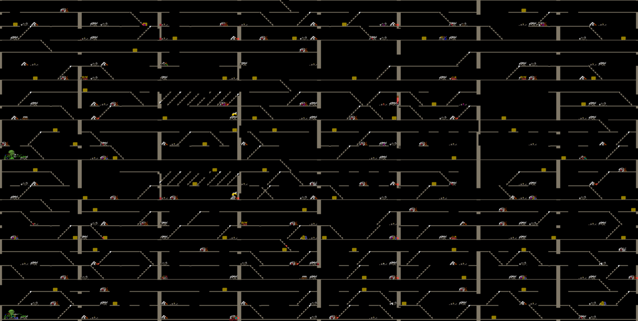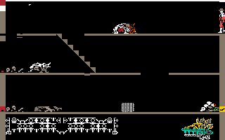 Each room is divided into three levels, some continuous, some open, and some connected by stairs. Platforms and stairs are gray against an otherwise black background, giving the game a gloomy atmosphere. Only the animals lurking in the depths, as well as the chests and piles of trash, are colorful.