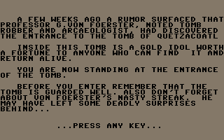 Contrary to this version of the backstory from the cassette version's inlay, the game's introduction itself states that the notorious tomb raider Prof. G. von Foerster found the entrance to Quetzalcoatl's tomb and maliciously filled the burial site with deadly surprises: