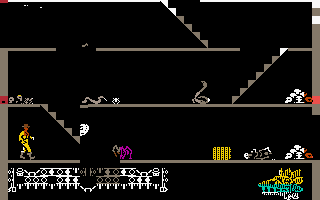 The game largely ignores the graphics capabilities of the C64 and VIC 6569, exclusively using monochrome bitmap mode for screen display (bitmap starting at address $2000, video RAM with color information starting at $0400). It completely forgoes the use of sprites; all characters and objects in the temple rooms are incorporated into the graphics. However, since this occurs with both the bitmap data and the color information via XOR operation, numerous unsightly artifacts appear with moving objects as they move in front of walls or stairs in the temple. Similarly, the animation of the figures is asynchronous with the VIC's screen output, so the figures periodically become completely or partially invisible for short periods.