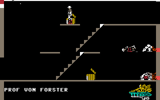 In the left animation of the following gallery, a stick of dynamite lit by the player character does not remain in the room where it was placed, but instead follows the character's movements into adjacent rooms. The same error can also be observed when moving to another floor, where a quick return to the original room is then impossible, and the explosion may destroy important objects. Nevertheless, the manual glorifies this malfunction as a feature (see section "Hints").