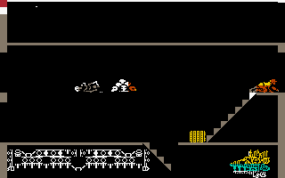The sound output is programmed in a similarly spartan fashion as the graphics. It is limited to background music for in-game events; there are no melodies. Only the first voice of the SID chip is used, and when the frequency parameter is set, usually only the high byte is written. Generally, only the noise generator is audible; a rare exception is the short sequence shown below, which occurs when the player character falls.
