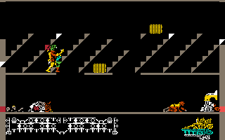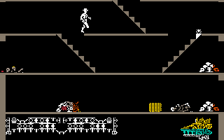 During the game, the top 168 grid lines of the screen display the room in which the player character is currently located; The remaining 32 grid lines (corresponding to 4 lines of text) are reserved for displaying message texts and carried items. If no text is currently displayed, an ornament is shown on the left and a god's mask on the right. Both are briefly damaged when the player character uses dynamite to blast holes in the ground, and the character can then step on them (see the middle animation in the first gallery in the section "Tips").