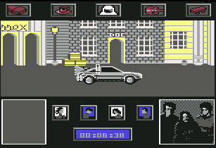 The screen is divided into three parts. In the upper bar there are five icons with symbols of items that you can use in the course of the game. If you stand in front of an item, the icon gets yellow, if you have one of those items, the icon will turn white. In the lower third there is an image of Marty on the left side and one of him and his two sisters on the right side. Depending on the development in the game, the images dissolve slowly or start to rebuild. In the middle there are smaller images of the other characters in the game; Dr. Emmet „Doc“ Brown, George McFly, Lorraine Baines McFly and Biff Tannen. If these characters are near Marty, the corresponding image gets white. When they are "on the right track" the image gets green. The game itself takes part between those two information bars. Here you steer Marty through the street and into five buildings. While the street scrolls fluently, the buildings are each only one room the size of a screen.