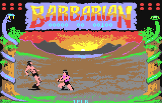 Barbarian is divided into two parts which must be loaded individually. In the first part (Practice) you can practice with different opponents, to familiarize yourselve with the controls and gameplay. In this section, two players can fight in a tournament. In the second part (Tournament), you have to fight for the princess. You need to prevail against a number of different fighters and finally defeat Drax, the sorcerer. The barbarian character knows sixteen different offensive and/or defensive moves. At the right top and left top of the screen you will see the energy of the players indicated by red dots. Depending on the type and strength of a successful attack, the attacked player looses a half or a full point. A player is defeated when his energy has depleted, or he dies another gruesome way.