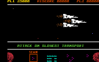 If at least one of the player's spaceships reaches the target planet, they receive 1,000 points for each cargo ship that survives the journey undamaged. They then embark on the next mission, with these transport missions becoming progressively more challenging: Firstly, the number of cargo ships gradually decreases from an initial 15 to a final 5, making it increasingly difficult to deliver at least one freighter to its destination undamaged; secondly, both the player's and the enemy's spaceships move progressively faster.