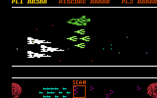 A multitude of enemies attack the fleet of cargo ships, usually from the front, but sometimes also from behind. Unfortunately, due to their consistently either light green or dark green coloring and similar design, the enemy spaceships are difficult to distinguish in the heat of the game. Each enemy destroyed is worth 100 points.