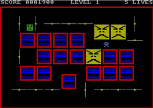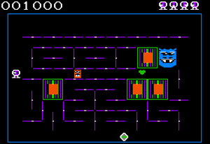 To make it not so simple, the Trollaboars chase the Drelb through the labyrinth - first, only one, in later levels more. They can also move the revolving doors. To buy some time, the Drelb can imprison his pursuer by closing a square, in which a Trollaboar lingers at that moment. But this doesn’t last very long and after a few seconds the fiend brakes free again and continues his chase.