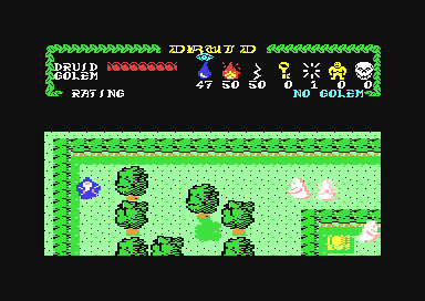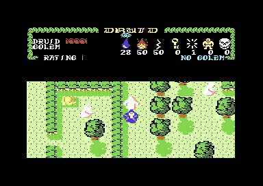Druid is a computer game that was released by the software company Firebird in 1986. Strictly speaking is the game a clone of the well-known game Gauntlet, which again is an action adventure with a slight pinch of a role play game. The role play game elements are, however, more in the foreground in Druid than in the known original. With the joystick you steer a Druid sprite (named: Hasrinaxx) and with the keyboad you control a Golem. The later can even be played by another person with joystick in port 2. The graphics scroll and show a view from above.
