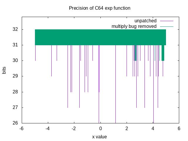 | current | 11:05, 4 July 2020 | 640 × 480 (6 KB) | Ray Chason (talk | contribs) | Graph of accuracy of the BASIC 2.0 EXP function, in significant bits matching the true value. Higher is better; a perfect match is 32 bits, the precision of the BASIC floating point type. The purple spikes show the effects of the multiply bug. Self-made work released into the public domain. |