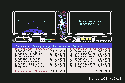 | current | 22:31, 2 February 2015 | 400 × 266 (7 KB) | Kenzo | Score: $21.8M. Played 2014-Oct-11 on CCS64 for Windows, with no cheats, no pausing, and no "mapping" of typical enemy patterns. No casualties, no lost allies, no ship damage costs, 100% cargo, high early bonus, and exceptional number of bounties for th… |