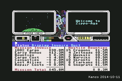 | 21:04, 2 February 2015 | 400 × 266 (7 KB) | Kenzo | Score: $45.8M. Played 2014-Oct-11 on CCS64 for Windows, with no cheats, no pausing, and no "mapping" of typical enemy patterns. No casualties, 1 lost ally, no ship damage costs, 100% cargo, high early bonus, and good number of bounties. |