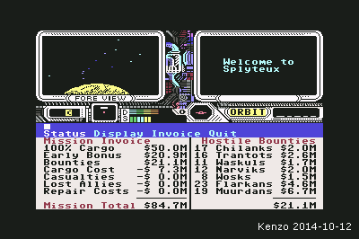 | current | 20:57, 2 February 2015 | 400 × 266 (7 KB) | Kenzo | Score: $84.7M. Played 2014-Oct-12 on CCS64 for Windows, with no cheats, no pausing, and no "mapping" of typical enemy patterns. No casualties, no lost allies, no ship damage costs, 100% cargo, high early bonus, and lots of bounties. |