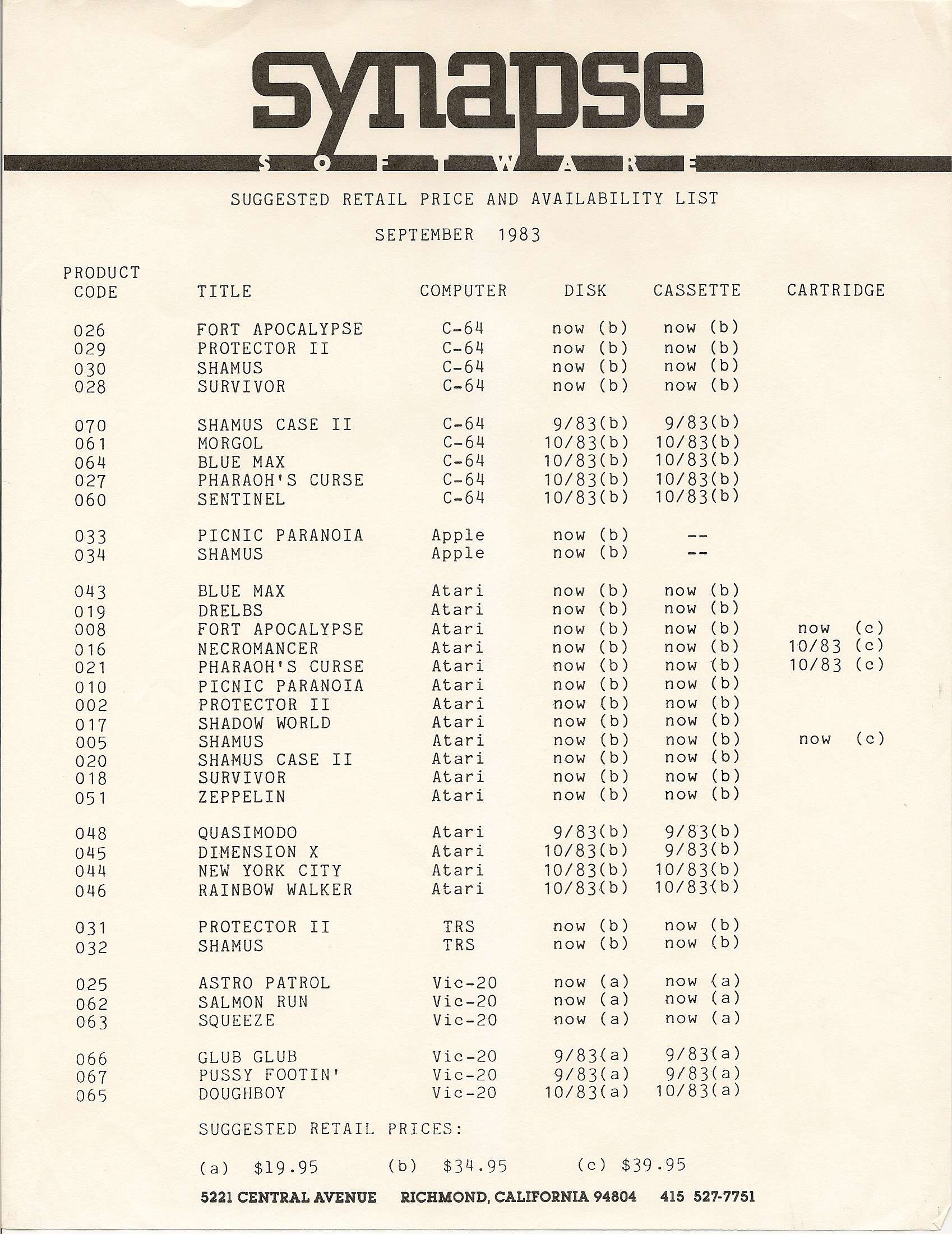 Synapse Software; Suggested Retail Price and Availability List (Sept. 1983)