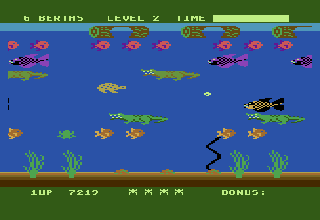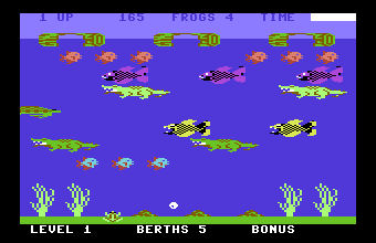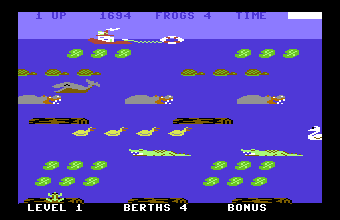 and this precisely into the ring and not against the boat, or else you will have one Frogger less and the boat will need new paint. If Frogger falls into the water, he sinks back down to the ground of the first screen.