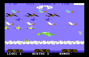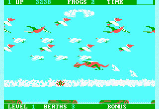 in this screen and Frogger can only reach them by getting transported by the altogether harmless birds on their back But first you have to take lots of swing on the apparently elastic clouds, to be able to reach at least the lowest row, by jumping up several times.