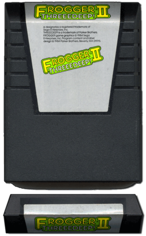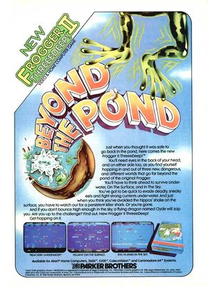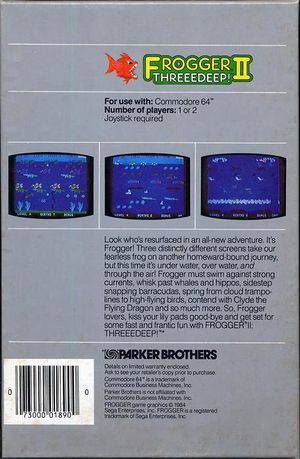 Frogger II: ThreeeDeep! is a skill game developed by Parker Brothers from 1984, which was planned as a follower of the home version of the arcade hall hit "Frogger". Parker Brothers had bought the licence from Sega, to publish cartridge versions of Frogger (the rights for the disk version went to Sierra Online) and their version of the game from 1983 turned out to be a hit. Therefore it was reflected that the licence should be used again very soon, with regard to the collapse of the video game market being on the horizon, and repeating the success of the previous year. It was to be the last game that Parker Brothers published for the C64.