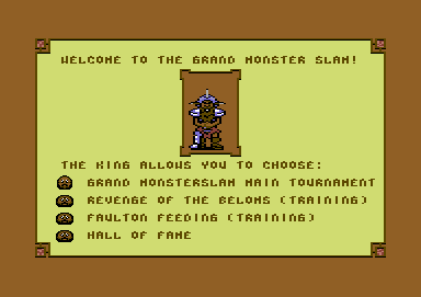In the main menu you can choose the current "Hall of Fame" to look at the highscores. With "Faulton feeding" and "Revenge of the Beloms" you can train the intermediate games. "Grand Monster Slam Main Tournament" starts the main game.