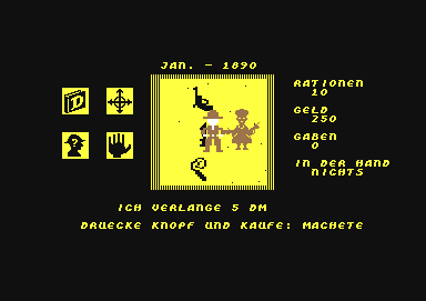 The direction icon gives you a quick overview about how much of the region you have already explored. In the towns and villages you reach the sketches that the natives have drawn you by using the direction icon (natives swap goods against gifts. To purchase just stand next to a native in his hut; then you will know what goods he trades. You place yourself on the items: confirm the ones you want to buy by pressing the fire button. Note the price information on the screen. In each town there is a tradesman, who buys and sells items. If you fulfill a tribal chief's desire, he tells you where valuable items are buried).