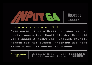 INPUT 64 (ISSN 0177-3771) was a computer magazine for the C64, which was published monthly in Germany from 1985 until 1988. It contains a data medium like a datasette or a floppy disk, which a electric computer magazine (today known as diskmag).
