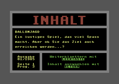 The advantage of the thise magazine was, that over the diskmag menu the readers the programs can easily load and start. The software was described in detail in the print computer magazine. The tape and the floppy disk was write protected!