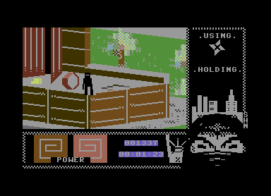 After the start of the game you find yourself on a concert stage in the "Central Park“. Go behind the curtain and hit the yellow square which shortly flashes when you enter the room. It loses its colour and on stage a trap door opens. Jump into it and pick up the key in the store room. Leave the room through the stage entrance. Go to the left below the lower border of the screen. In the next screen there is another cop, then leave the stage area through the big passage in the encircling wall. At the wayside there is clown juggling with knives, who also throws with them. With somersaults you can avoid getting hit by the knives and reach the next screen. Here pick up the parchment lying on the wayside (from now on, every item flashes shortly when entering a new screen). Go further until you reach a wooden construction that is integrated into the wall. Climb up this scaffold. On the spur to the left until the sill is destroyed at two places, jump over them with a somersault. Then pick up the "Kendo Stick", back to the scaffold and climb it down backwards. Back to the stage area and to the right. Before that in the garbage bin between the two park benches you find a set of "Shuriken".