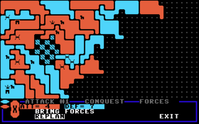 The unwritten law, that a wargame needs to look plain was also abided consequently in Lords of Conquest. That they did have the courage to release a commercial game with this mixture of charactersets and symbols on a downright stone-age niveau in 1986, must stem from the consent prevailing at that time, that the typical war game player would brake down due to stimulus satiation when looking at coloured high-resolution graphics. However, the clarity profits from this minimalism and thus the situation can be comprehended fast after a short familiarization. The sound can be noticed rather quickly as unpleasant - if one forgets to switch it off in the main menu - with repeating jingles when setting up a pawn or conquering a land. And even if you switch it off, you get faced with a DADADADAAAAA! from Beethoven's Symphony No. 5 with each move by the computer and at the end of the game even with a bearable version of the prelude and fugue no. 1 C-major, BMV846 (Video at YouTube ) from the "Well-Tempered Clavier" by Bach, if you want or not.