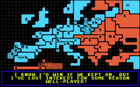 Sometimes, the AI will realize it cannot win and withdraws from the match with an amusing comment. This is always a cause for joy ("YAY, I have outsmarted an 8bit computer!") The computer opponent's comments are quite funny.
