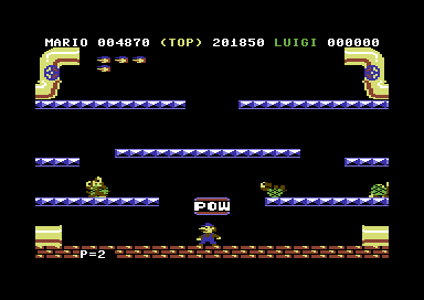You either play alone with Mario or in twos with Luigi, Mario's brother, joining in. In the game, you need to knock over all enemies by jumping against the platform on which they move from below and then collect them. In the first level these are turtles, later crabs and ghosts follow. If you do not collect the knocked over turtles in the first level fast enough, they turn around again and get faster. Then also the colour of their shell changes from green to blue and after a short time to red. For each collected enemy you can also try to collect coins. Below there is also the POW switch. By jumping against it with the head you can knock over all enemies at once. But keep in mind that you can only use it three times. After the second level, there is a bonus level in which you have to collect coins within a limited time span.