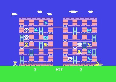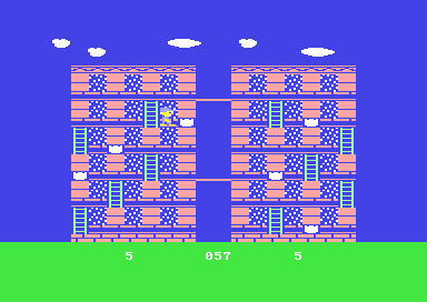 Memory Manor is based on the principle of "Memory". The house is shown from the side. The player takes over the control of Willie who can walk left/right, climb ladders and clean windows. At the start 3 white containers per side need to be filled with the help of a helicopter (place helicopter over water container and pull joystick forwards while pressing the fire button). After each 3 containers are filled, the rest of the containers disappear. Then Willie needs to be transported to the façade with the helicopter (place helicopter in front of Willie, press fire button, transport him to the façade, press fire button). During these actions you can take a look at the inhabitants of each window. The player has to remember now behind which window happy people live or where bonus items are and clean those windows after a rain shower. To be able to clean windows he has to first get water from a white container (place Willie in front of container, press fire button). As Willie has only a limited amount of water, he must not clean too many other windows, depending on the difficulty grade. The game is over when Willie has no water any more. A round ends when all correct windows were cleaned. If you have cleanded all the correct windows and there is still water left in the container, you get points for each container that is still full.