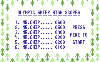 Kiki77: "When I had my new C64 a good colleague of mine came over with a cassette which contained Olympic Skier. It was really lots of fun in twos, but also only with one player. The graphics were kept simple, but the fun in the game was there many times over. For 1983 the graphics were still good. Therefore 8 big nostalgia points."