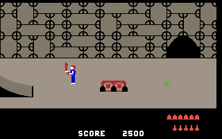 Both in the opening screen with the overall view of the temple and in the individual chambers, adversaries lurk for the player character. Numerous venomous snakes crawl across the temple's facade in the opening screen and across the floor of the individual chambers; venomous giant spiders also lurk inside the temple. If the player character comes into contact with one of these enemies, they have only 60 seconds to find a healing herb inside the temple and collect it as an antidote (left animation in the gallery below). If they fail to do so in time, the player character loses one of their initial three lives. Fortunately, an extra life is awarded each time the player advances to the next level, as well as after collecting every 20 treasures (middle animation).