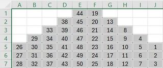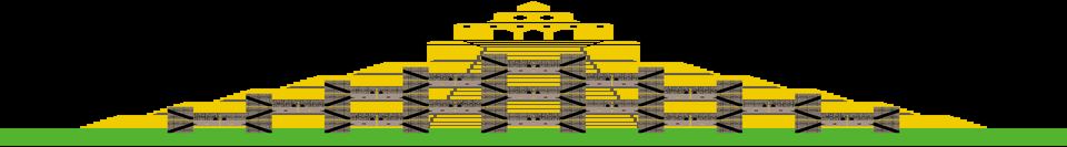 Within the temple, movement is only possible vertically from top to bottom through a group of rooms directly above one another. The building is therefore divided into 10 columns, each with an entrance at its apex. In the game's opening screen, these entrances are reached by climbing the pyramid-shaped temple complex on the left or right and then entering the uppermost room of one of the five levels. The player character then descends to the next lower room via an exit door and a slide behind it, until finally emerging at ground level through an exit of the temple.