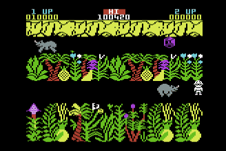 Firebird played it safe with this conversion, and rather than exploit the talents of the C64’s SID and VIC chips, they settled for an almost one-hundred percent clone of the ZX Spectrum original. The background, jungle, and animation all mirror their Speccy counterparts. Sabre Man’s fencing movements are more elaborate but still look choppy. Larger sprites, like the rhino or Sabre Wulf, flicker worse than they do on the humble Speccy. Disappointingly, the screens don’t scroll and instead merely flip to change. The sound effects don’t improve much on the Spectrum’s lo-fi one-bit beeper. Three short jingles play at the start and end of the game and whenever the player collects a piece of the charm. These, like the title screen’s music, come from Bach (BMV846). Disappointingly, the game's high score table does not save.
