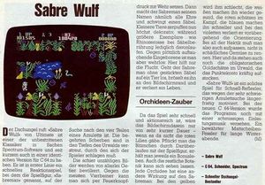 Robotron2084: "Seen in the historicaly context it is surely a milestone in the action-adventure genre, at least on the Spectrum. But what we got here on the C64, looks to me rather loveless, it is too similar to the original version, which in my opinion can be played on the spectrum with much more grip. Sabre Wulf is far from being a conversion catastrophe as e.g. Jet Set Willy, but it could have been a bit "more". Flickering sprites and unfair situations as long vertical corridors, in which you can neither fight nor sidestep or natives, that run you over out of the blue, dampen the fun in the game. However, Sabre Wulf is an above-average game all in all, which inspired dozens of imitators, as e.g Robin of the Wood, Starquake or Firelord, whereby especially the latter two outrank the prototype without any problems. 6 out of 10 points."