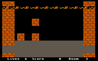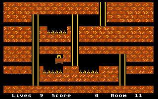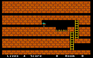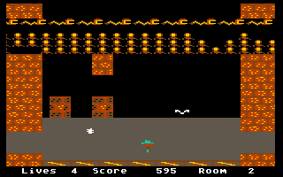 In rooms with a tiled floor, whether in a cave system or in open-air rooms, the joystick only controls the character's movement: Left and right movements make Shamus move in the corresponding direction; in combination with the fire button, Shamus jumps and thus overcomes pits or gaps in the floor. If he is on a ladder, joystick movements up or down make Shamus climb up or down.
